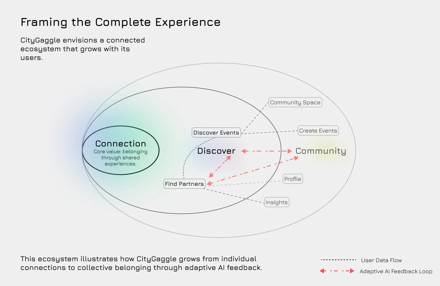 The design goal was to bridge human belonging with sustainable engagement. The intersection defines CityGaggle’s core value —— connecting newcomers and locals through shared city experiences.