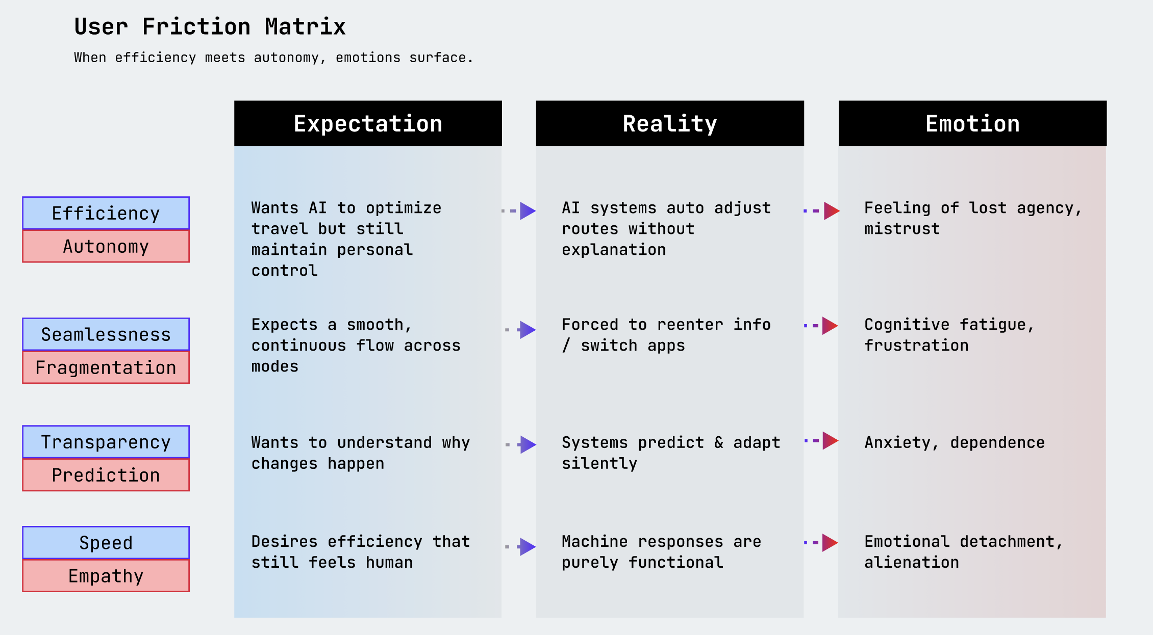 To understand how current systems shape user experiences, I analyzed major mobility platforms and interviewed daily commuters, e-bike users, and autonomous car passengers.