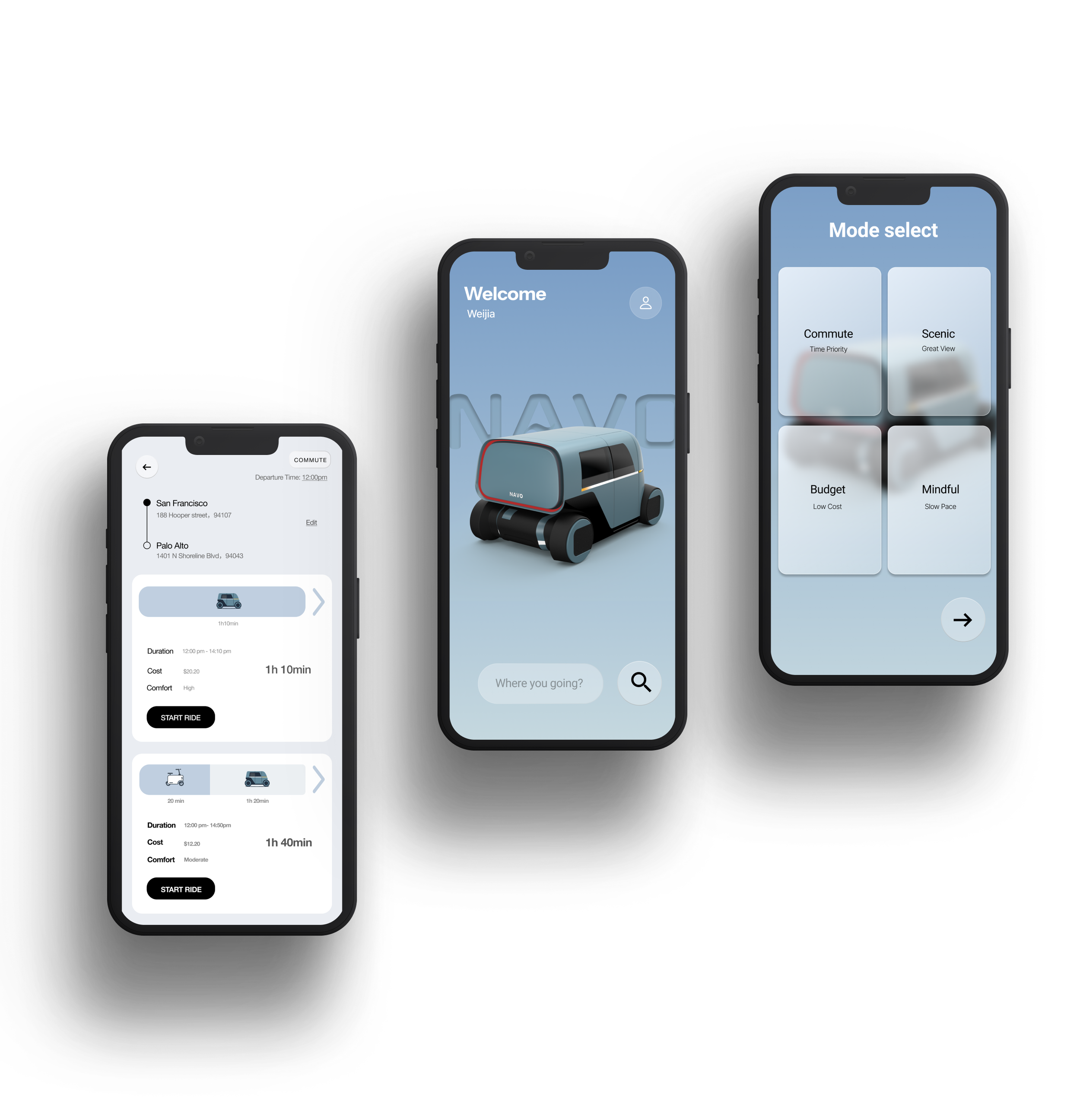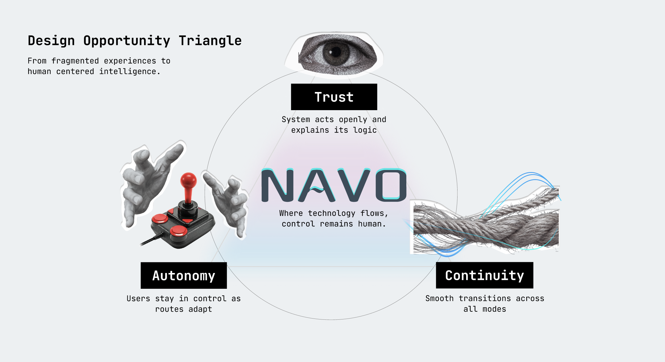 These insights define Navo’s design direction: to create a fluid, human-centered mobility ecosystem that restores both control and confidence.